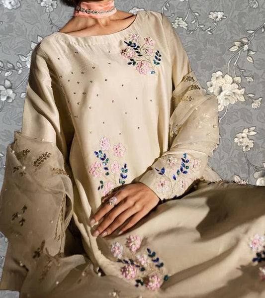 Beige Embellished Pakistani Dress with Floral Embroidery – Model PR-0260