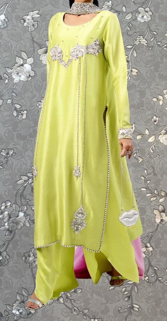 Lime Green Embroidered Dress with Dupatta & Pouch – Designer Formal Wear Pink Tulip PR-0309