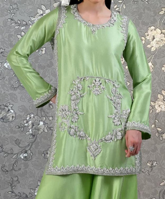 Light Green Embroidered Dress with Pants – Elegant Designer Wear Pink Tulip PR-0315