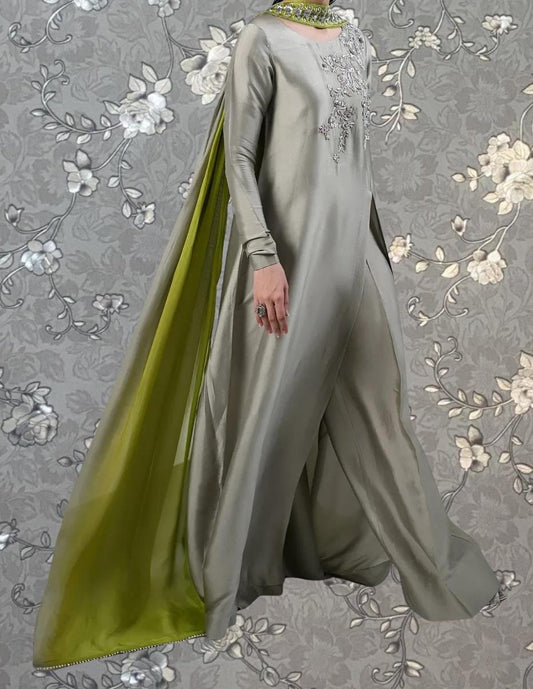 Light Gray Embroidered Dress with Green Dupatta – Elegant Designer Wear Pink Tulip PR-0313