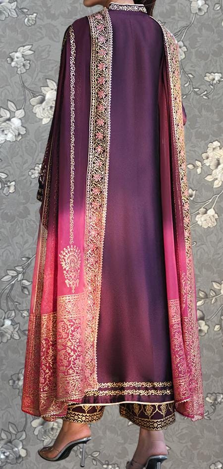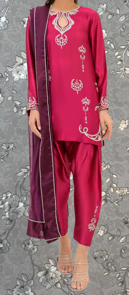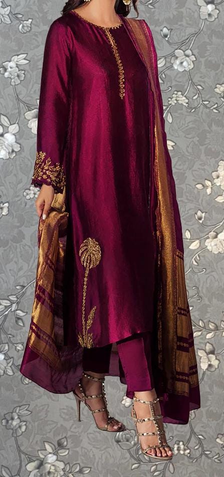 Magenta Embroidered Shalwar Kameez Set with Gold Mirror Work Dupatta – Pink Tulip PR-0412
