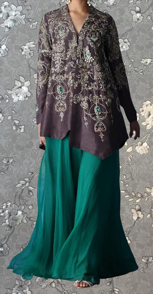 Luxury Embroidered Brown & Green Formal Dress | Pakistani Party Wear | Handcrafted Embellished Top with Flowy Skirt | Pink Tulip PR-0445