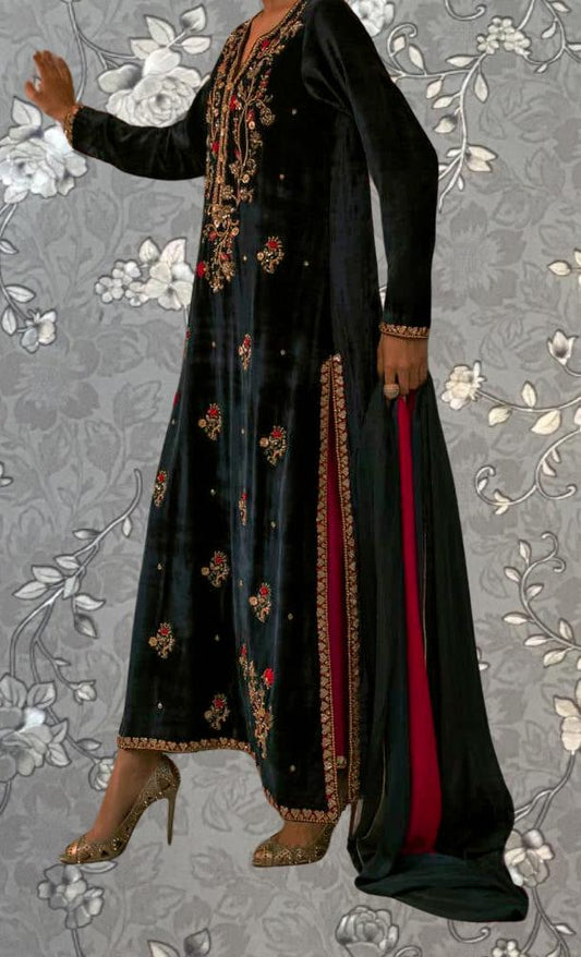 Luxury Black Velvet Embroidered Long Dress with Dupatta | Festive & Wedding Wear | Designer Pakistani Formal Outfit by Pink Tulip PR-0466