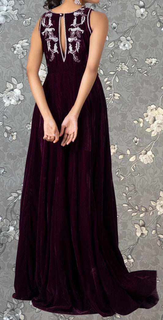 Maroon Velvet Long Dress | Embroidered Formal Maxi | Elegant Winter Party Wear | Pink Tulip PR-0476
