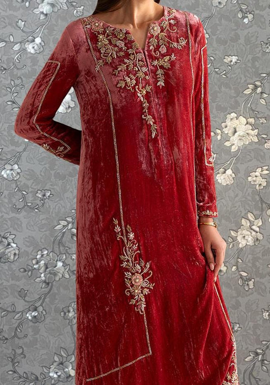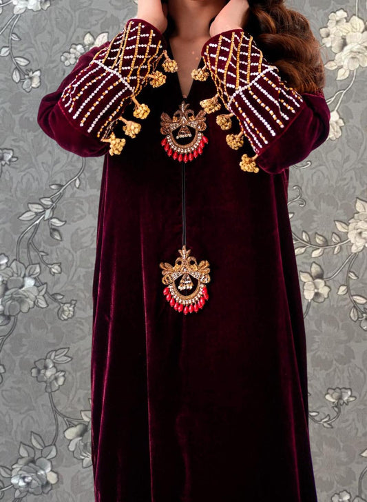 Maroon Velvet Embroidered Dress | Handcrafted Festive & Formal Wear | Designer Pakistani Outfit with Pant , Dupatta by Pink Tulip PR-0467