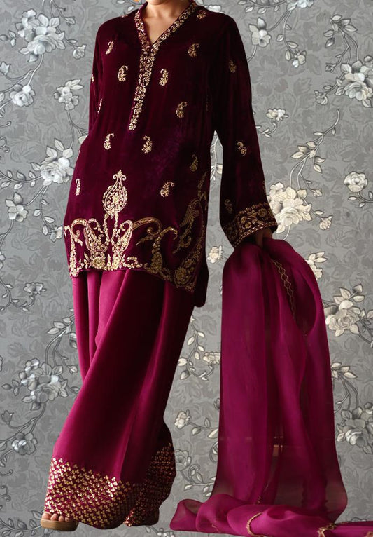 Maroon Velvet Embroidered Pakistani Suit with Dupatta Formal Party Wear Dress Wedding Eid Outfit Designer Embellished Set Pink Tulip PR-0503