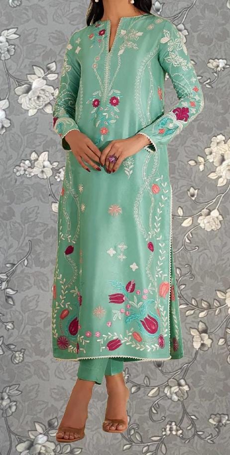 Mint Green Silk Embroidered Pakistani Shalwar Kameez Set with Dupatta – Pink Tulip PR-0410