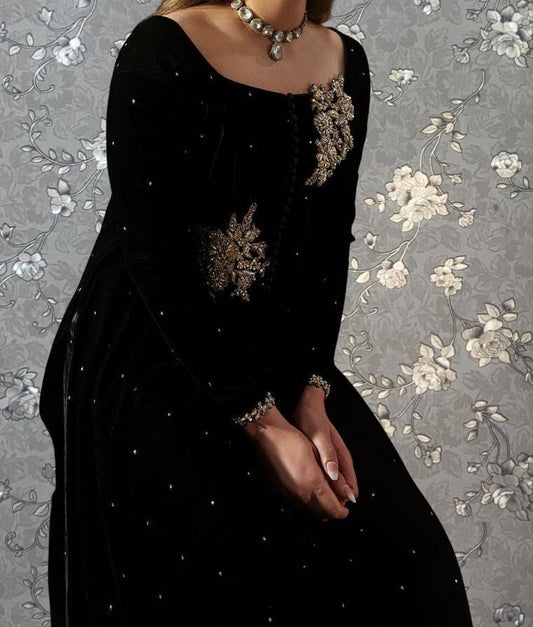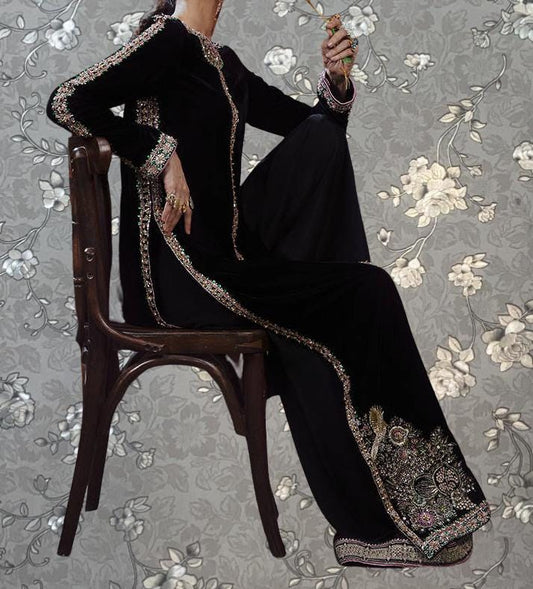 Black Velvet Embroidered Dress | Luxury Formal & Wedding Wear Pakistani Outfit Pink Tulip PR-0486