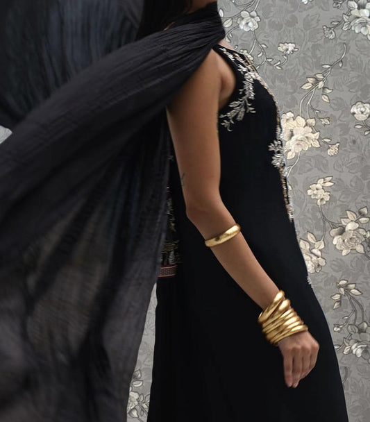 Black Velvet Embroidered Long Dress with Pearl Detailing & Golden Dupatta | Luxury Formal Wear | Pink Tulip PR-0474