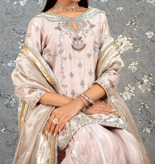 Pastel Pink Embroidered Short Shirt & Gharara | Luxury 2-Piece Pakistani Wedding Outfit PR-0159
