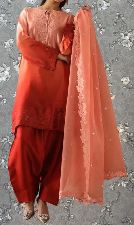 Peach & Red Ombre Embroidered Pakistani Suit with Lace Dupatta | Festive Wear by Pink Tulip PR-0351