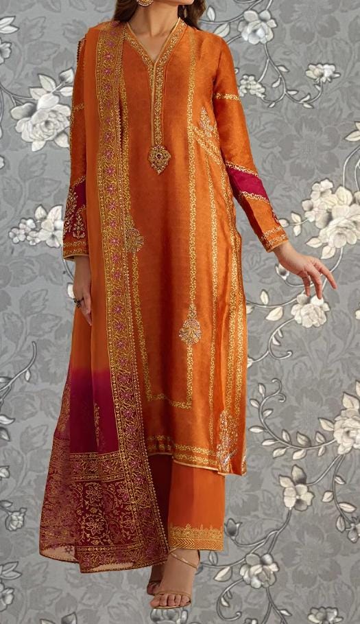 Orange Embroidered Formal 3 Piece Suit with Dupatta | Pakistani Designer Wear by Pink Tulip PR-0215