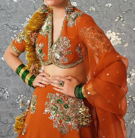 Orange & Green Hand-Embroidered Bridal Lehenga by Pink Tulip | | Designer Wedding Outfit with Dupatta Model PR-0203