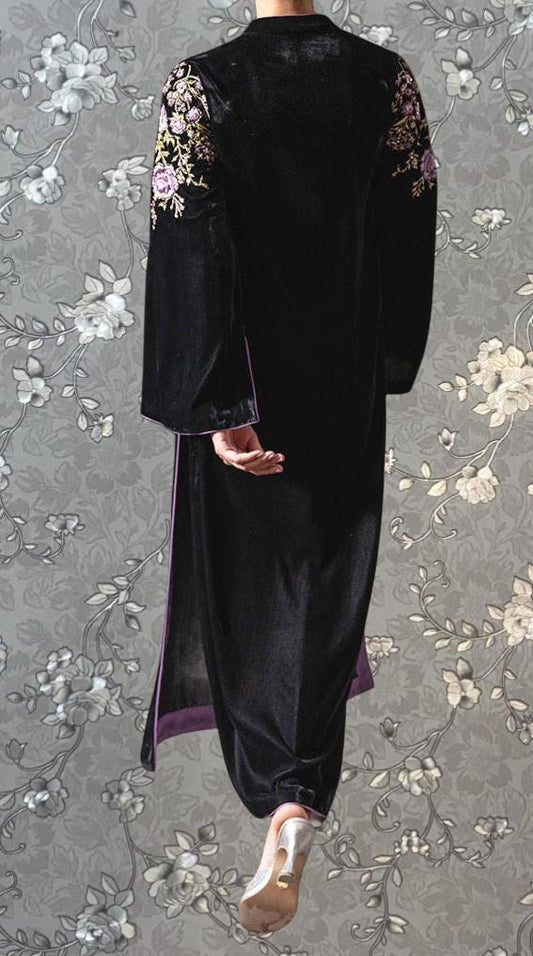 Black Velvet Kaftan with Lavender Floral Embroidery | Formal Long Dress by Pink Tulip PR-0336