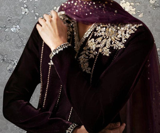 Plum Velvet Embroidered Long Dress with Sequined Dupatta | Formal & Wedding Wear | Pink Tulip PR-0472
