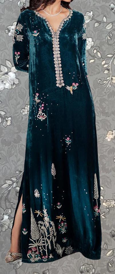 Pink Tulip Teal Velvet Embroidered Pakistani Dress - Elegant Formal Wear & Wedding Attire - Model PR-0240