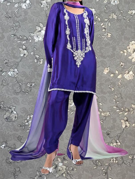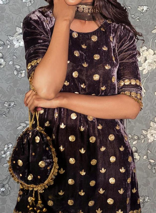 Purple Velvet Embroidered Salwar Kameez with Dupatta & Pouch - Elegant Traditional Outfit | by Pink Tulip PR-0231