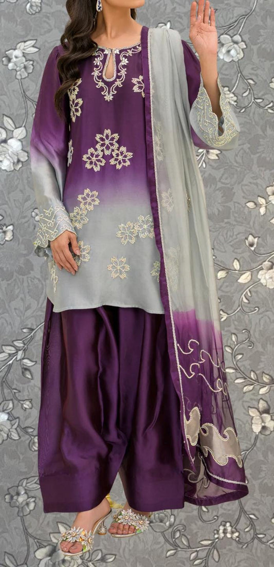 Purple Embroidered Dress with Gradient Dupatta – Designer Formal Wear Pink Tulip PR-0314