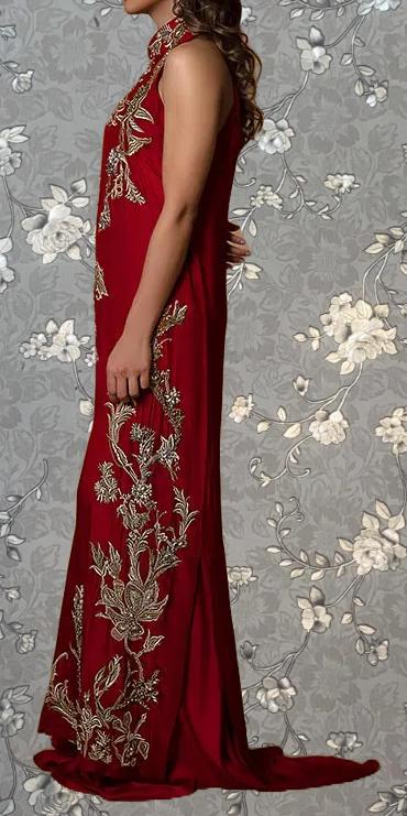 Red Embroidered Halter Neck Kaftan Dress with Gold Floral Detailing | Elegant Evening Wear by Pink Tulip PR-0233