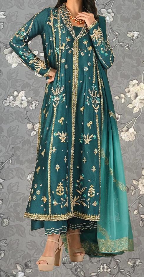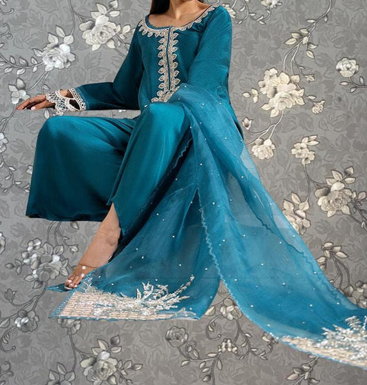 Teal Embroidered Silk Pakistani Kurti Set with Chiffon Dupatta | by Pink Tulip PR-0404