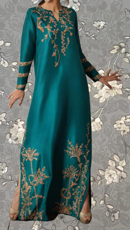 Teal Embroidered Long Dress - Elegant Floral Design | Traditional Indian Wear | Model PR-0253