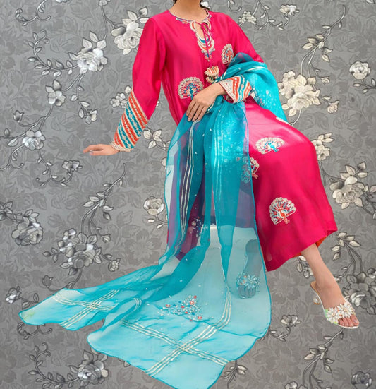 Vibrant Pink Floral Embroidered Tunic & Pant Set with Turquoise Dupatta – Pink Tulip PR-0292
