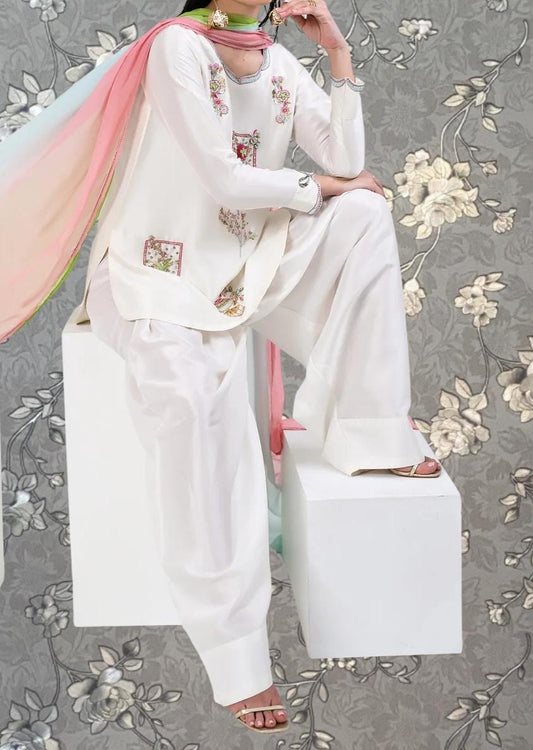 White Embroidered Dress with Pants and Dupatta – Elegant Designer Wear Pink Tulip PR-0318