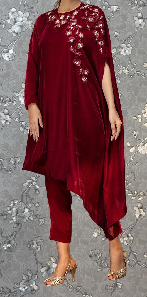 Velvet Maroon Embroidered Asymmetrical Kurta Set | Elegant Partywear Suit with Dupatta – Pink Tulip PR-0497
