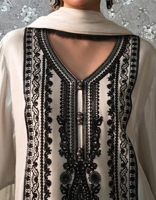White and Black Embroidered Pakistani 3-Piece Suit – Elegant Ethnic Set with Dupatta | Pink Tulip PR-0172