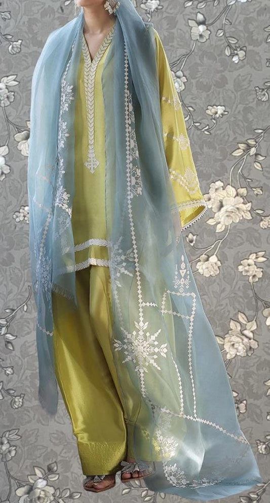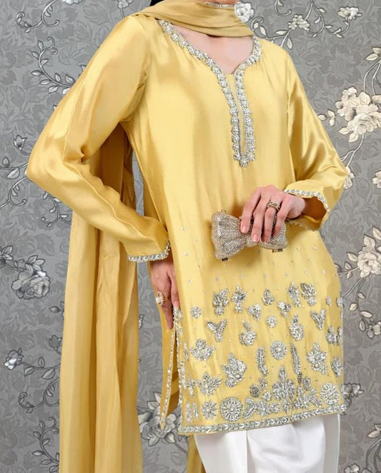 Yellow Silk Tunic with Embroidered Dupatta - Elegant & Ethereal Ladies Outfit Pink Tulip PR-0192