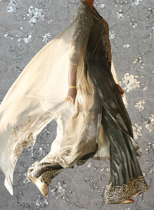 Charcoal Grey Embellished Formal Set | Velvet Kurta with Palazzo Organza Dupatta | Wedding & Festive Wear Pink Tulip PR-0518