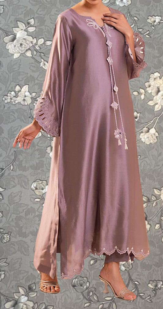 Dusty Mauve Embroidered Silk Kurti Set with Delicate Tassel Detail | by Pink Tulip PR-0406