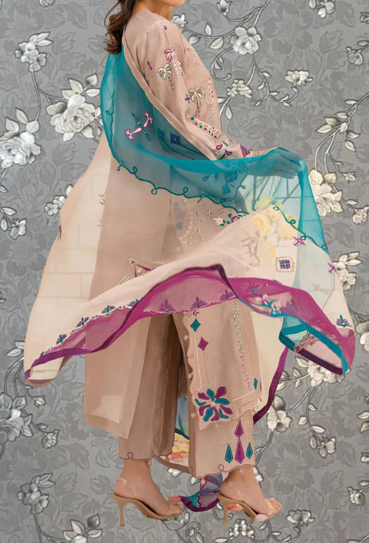 Elegant Beige Embroidered 3-Piece Suit with Maroon Organza Dupatta – Pink Tulip PR-0409